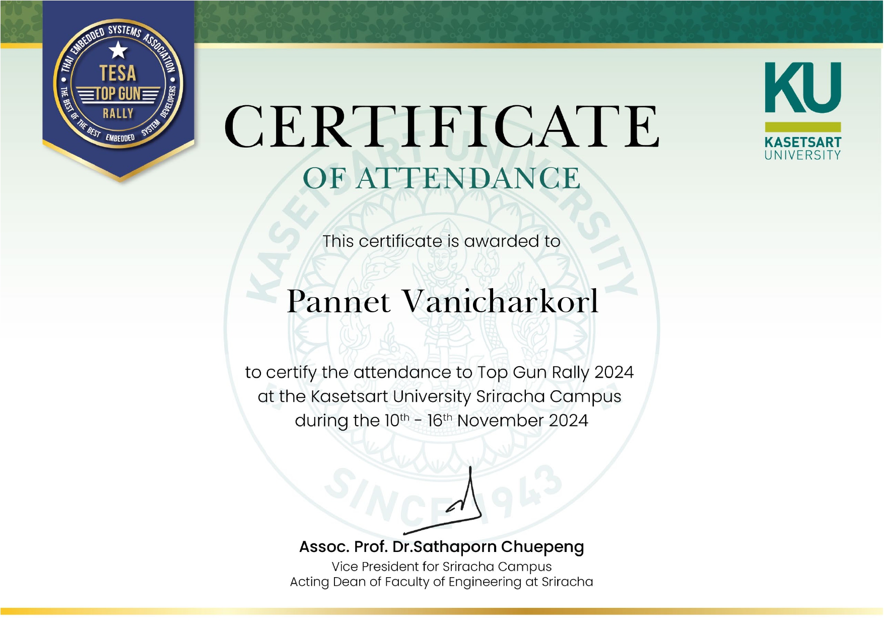 Currently a fourth-year Computer Engineering student at Kasetsart University Sriracha Campus, with skills in C++, Python, and Java, along with experience in web development and cybersecurity competitions. Interested in learning new technologies and aiming to become a software developer to create effective solutions.